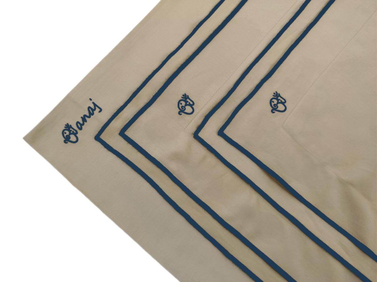 - Elegante Stickerei mit anaj Logo: Die dunkelblaue Stickerei und das ikonische anaj Logo heben sich elegant vom beigen Stoff ab und verleihen Ihrem Schlafzimmer eine luxuriöse Note.