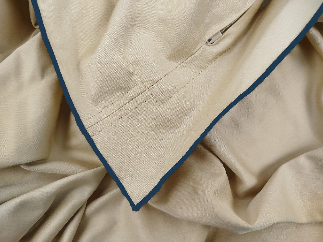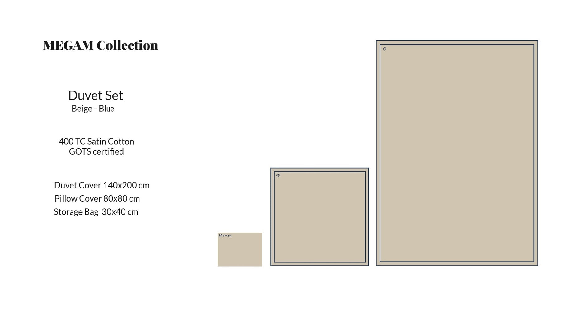 Verleihen Sie Ihrem Schlafzimmer einen Hauch von Eleganz und Nachhaltigkeit mit dem MEGAM Bettbezug-Set. Dieses Set, hergestellt aus feinster, GOTS-zertifizierter 400TC Satin-Baumwolle, wird durch eine elegante dunkelblaue Stickerei auf beigem Stoff abgerundet. Das ikonische anaj Logo, kunstvoll eingestickt, verleiht diesem luxuriösen Bettbezug-Set eine exklusive Note, die Ihr Schlafzimmer in eine Oase der Ruhe und Stil verwandelt.